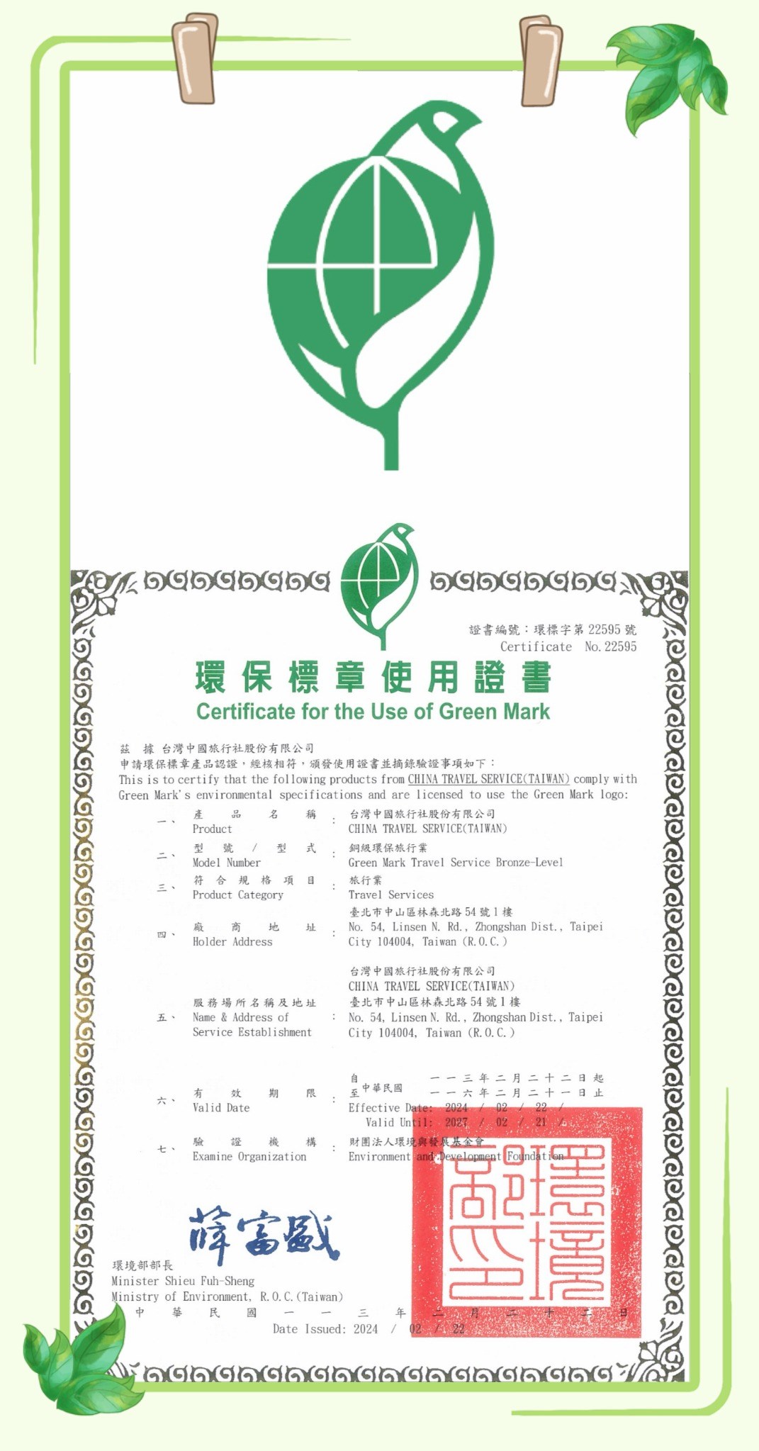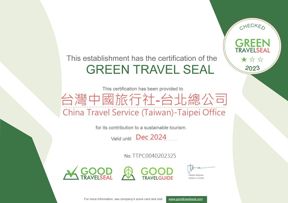 而在行程規劃上,能使用"綠色標章飯店"以及低碳行程,讓我們的旅客也能在旅遊的同時,做到愛地球,隨手做環保,在 2023獲得了Green Travel Seal 標章。代表人:黃德貞