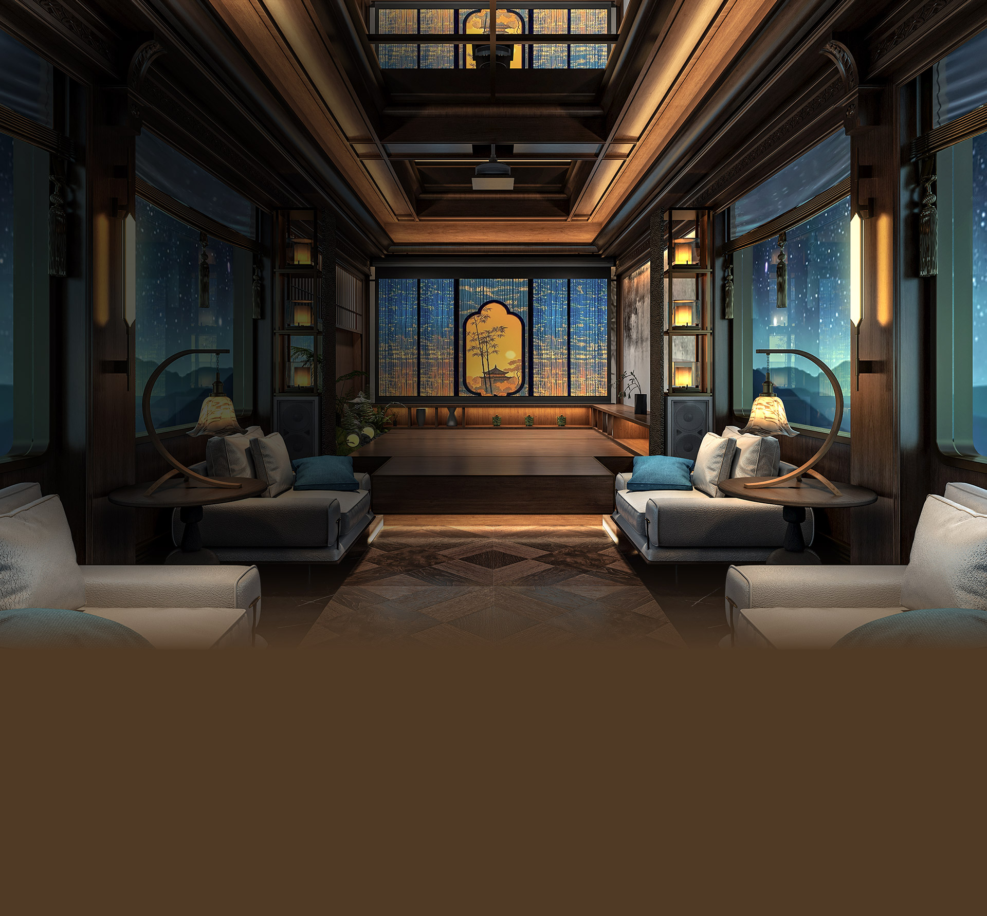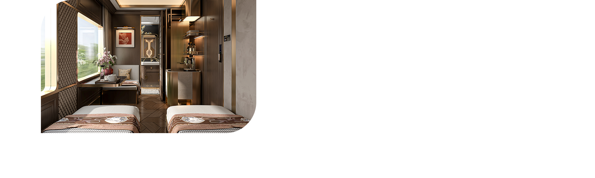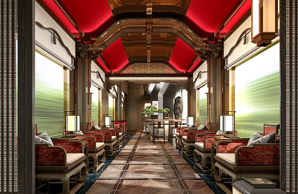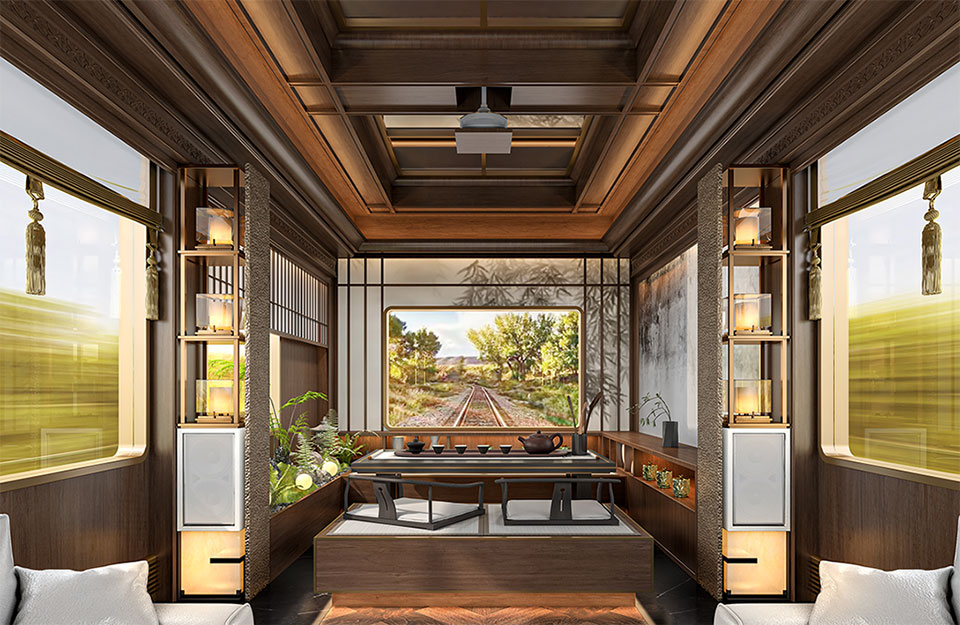 以寶石藍車體與金色蜀山線條勾勒遼闊山河意境,《錦繡天府號》以頂級奢華的符碼演繹宋韻為骨、巴蜀為魂的「天圓地方」哲思,融入芙蓉、銀杏、竹意等細節,匯集近六十件非遺臻品,讓旅客在沉穩高雅的移動藝境中,沉浸於中華文明的千年美學。