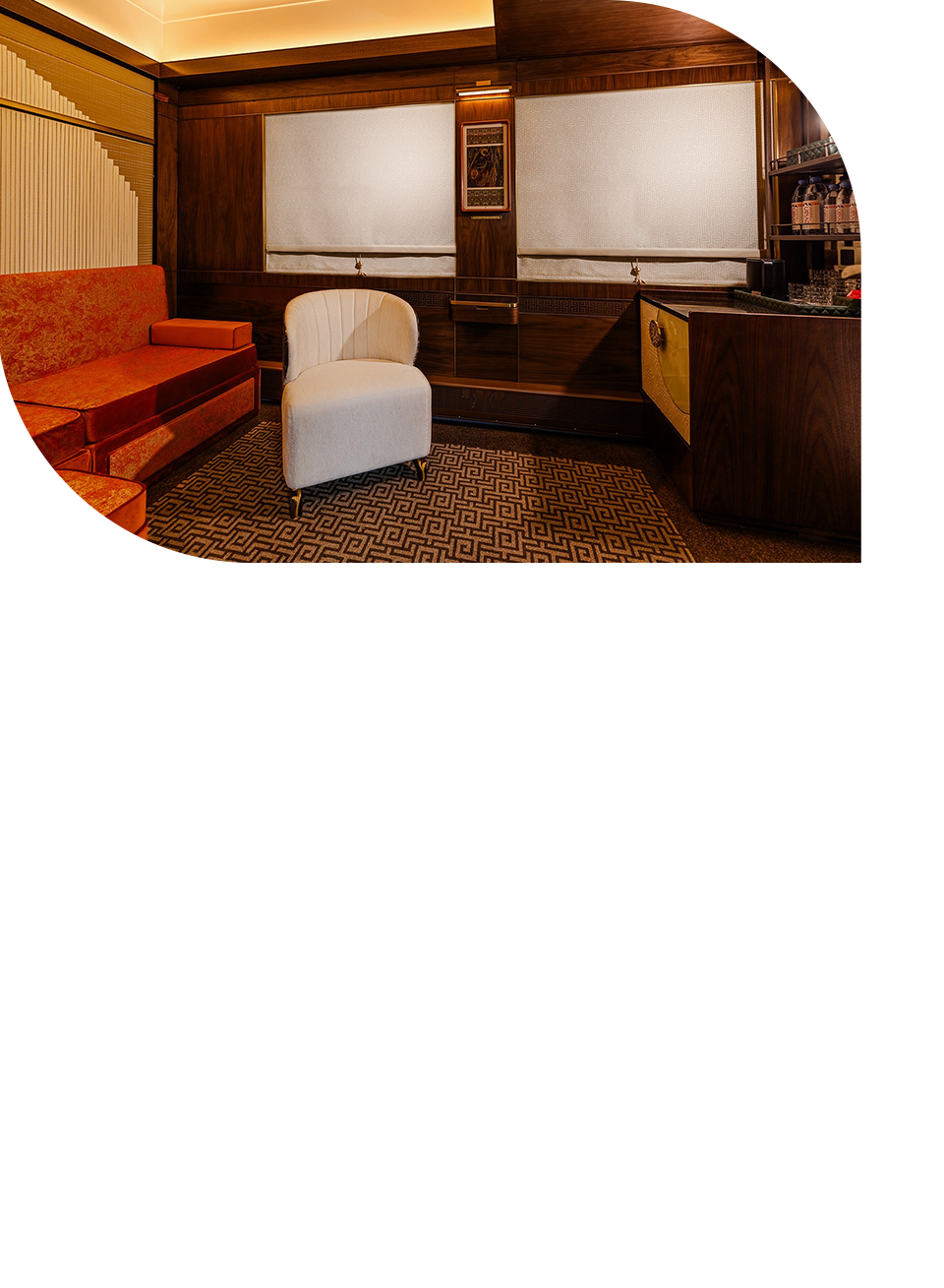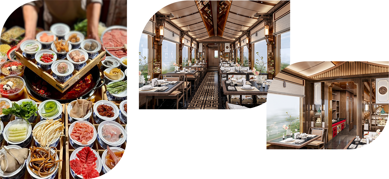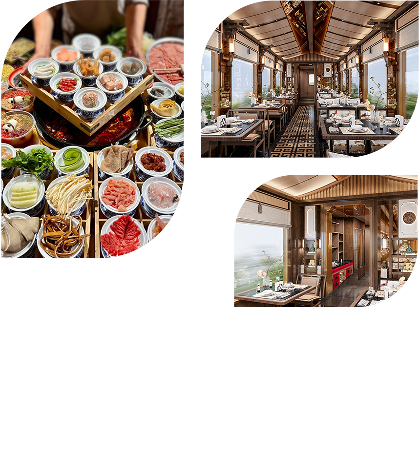 餐車規劃為餐廳、以及兩側的自助餐台,以宋韻為骨、蜀味為魂、移動觀宴為意, 融匯巴蜀飲食文化與宋代美學,開創「行進中的川味雅集」體驗,品珍饈、飲川茶、酌美酒,品人間至味。
