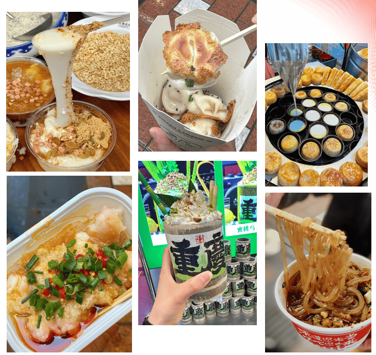 彙集了眾多地道的重慶小吃,如酸辣粉、麻辣燙、鹽水鴨、火鍋、鬼包子、拇指生煎、拔絲凉糕、江湖菜等。此外,还有许多网红美食和传统小吃,例如七孃手作荆州锅盔、百香柠檬凤爪、巴渝正月山城小汤圆、高品麻辣兔头等。八一路好吃街不仅是吃货的天堂,也是拍照打卡的好地方。