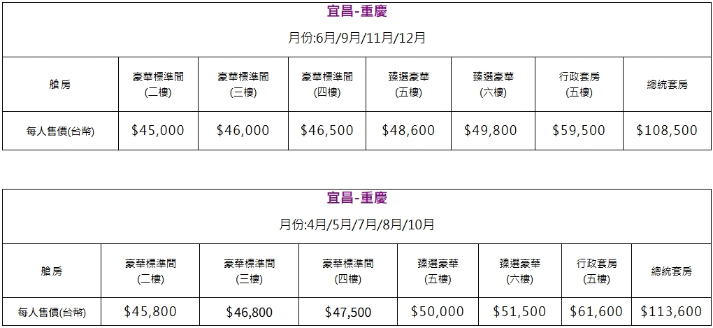 • 一價全含:全程不含任何上岸自費行程,真正打造「一價全含」的長江三峽遊輪體驗,讓賓客安心暢遊。