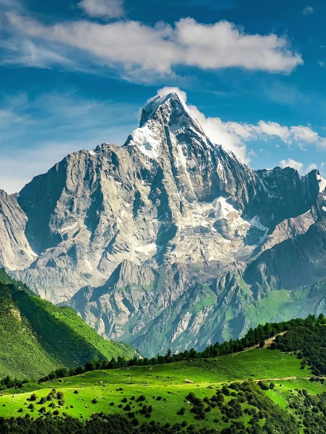 海拔6250M,雪白的山峰直插藍天,白雲在四周環繞,與雪山腳下的羌族民寨,構一幅雄偉壯觀的圖案,終年積雪,銀裝素裏,有〝蜀山皇后〞之美稱。