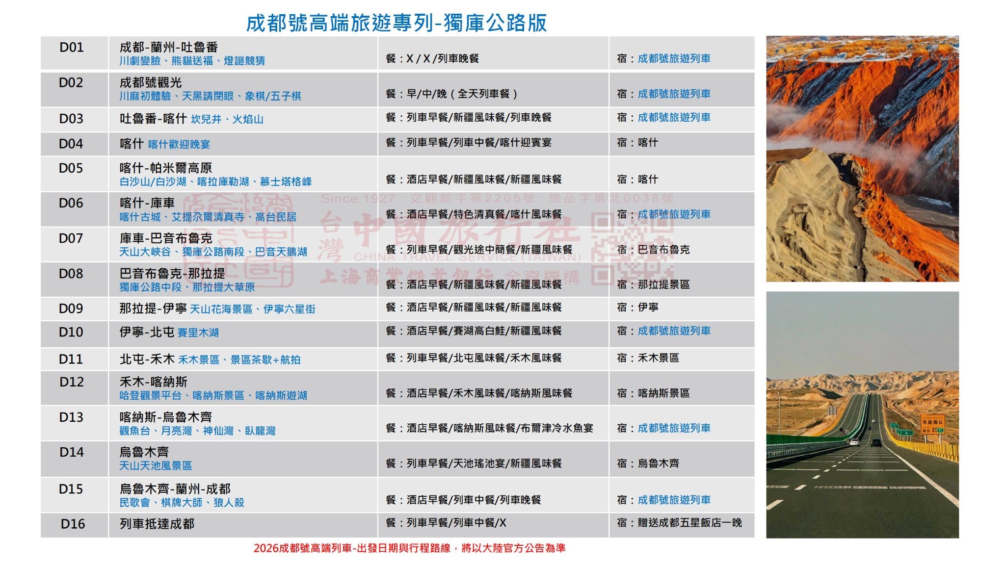 即日起至2025年10月31日止,預約報名成都號南北疆火車套裝行程,即享「早鳥四重禮」,讓您輕鬆出發、安心暢遊!