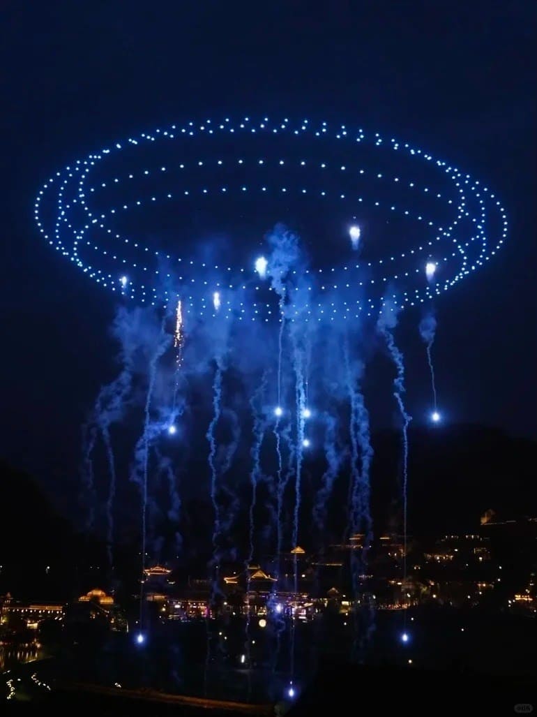 烏江寨無人機燈光秀結合科技與藝術,在壯麗山水間展演絢麗光影,隨音樂節奏變化出動態圖案,打造一場震撼視聽的空中盛宴,成為旅客必看的夜間亮點。