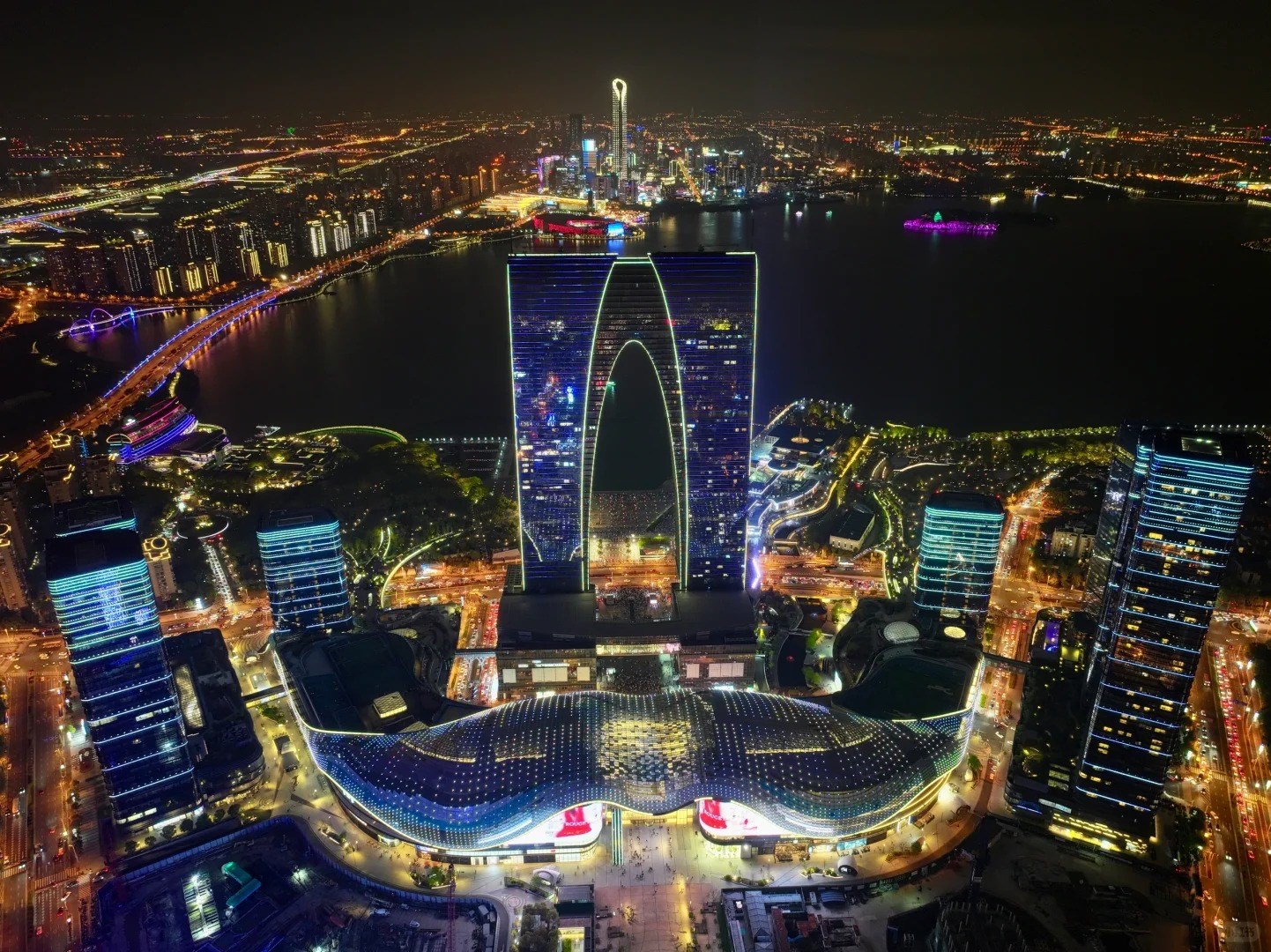 漫步金雞湖畔,仰望世界最大天幕「東方之門」,城市之光與湖水倒影交織成夜色裡的夢幻畫卷。