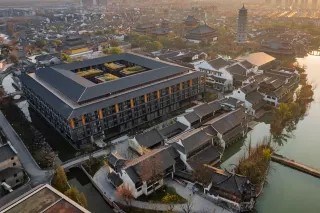 酒店整體屬歷史文化保護建築群,由11棟原國家廠絲倉庫設計、改造而成。獨特的開放式設計,將璀璨的人文景觀與運河秀美的自然景色合二為一, 相互輝映。酒店沿襲了運河航運倉儲古建築群的風格,具有重要的歷史價值,更是運河倉儲文化的實物見證。
