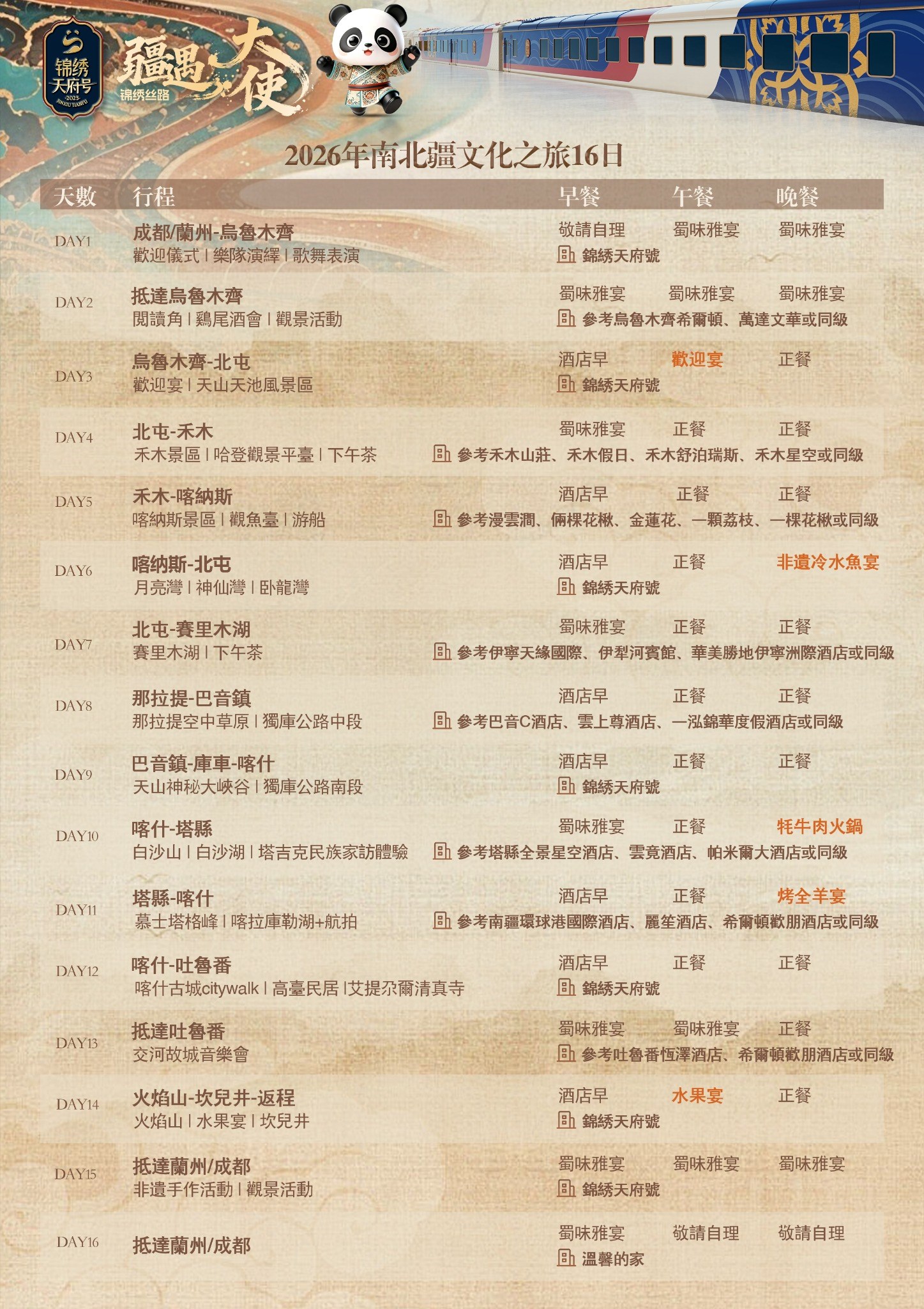 1. 2026 疆遇大使 南北疆16日-錦繡天府號火車票劵【火熱預售】:以下班期均有餘位,歡迎來電咨詢!