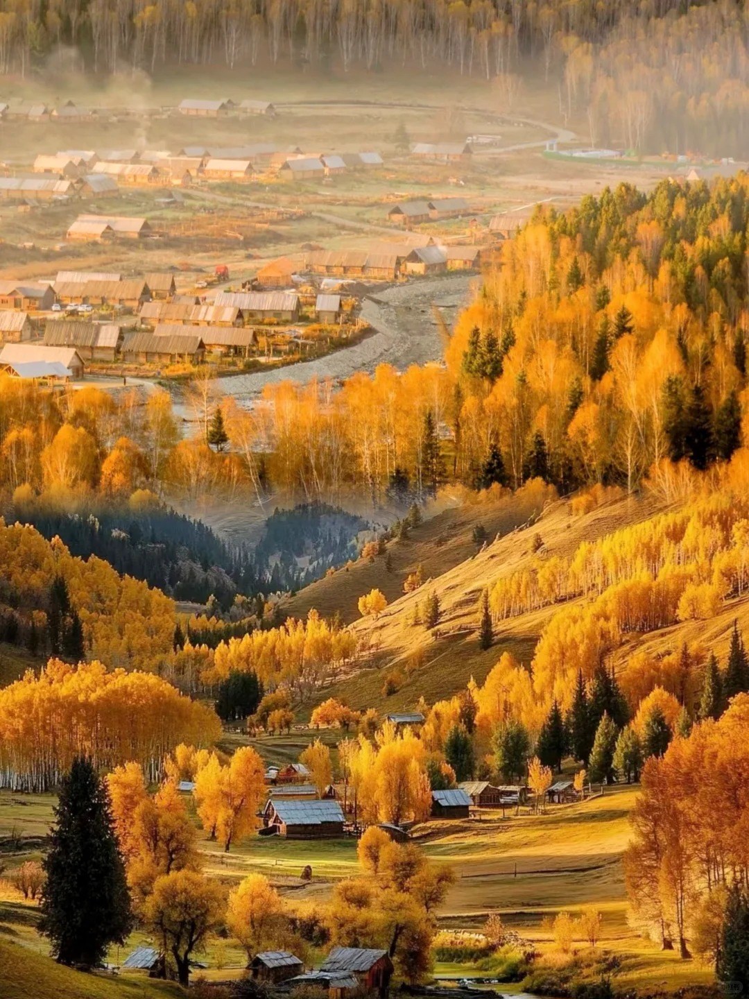 如同時光靜止的北國村落,木屋錯落於河谷與林海之間,炊煙袅袅,遠山與晨霧交織成詩。