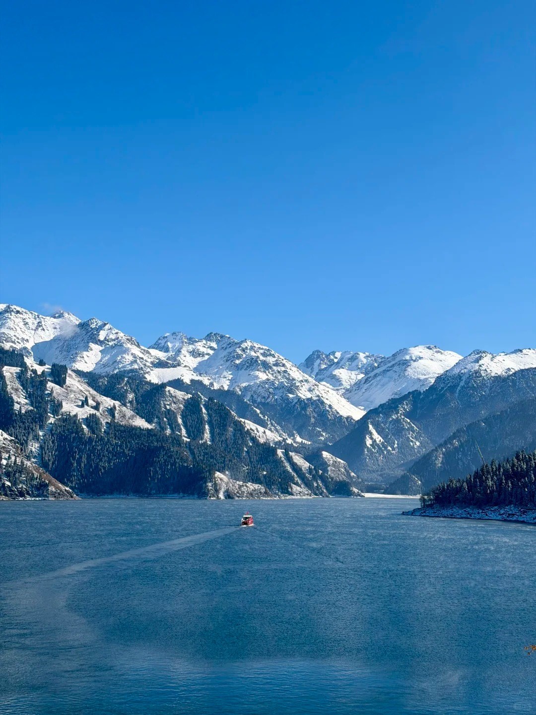 在湛藍湖水與雪峰倒影之間,可遠眺雄偉的博格達峰,感受天山的純淨與遼闊。