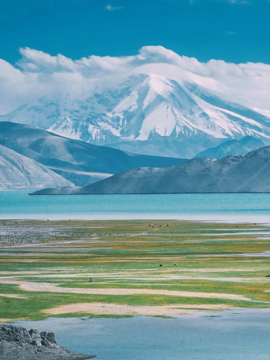 湖水因光線變化呈現多種色彩,被稱為帕米爾高原的「變色湖」,也是慕士塔格峰倒映其上的天然鏡面,景色純淨壯闊,停留約 1 小時欣賞湖畔風光。