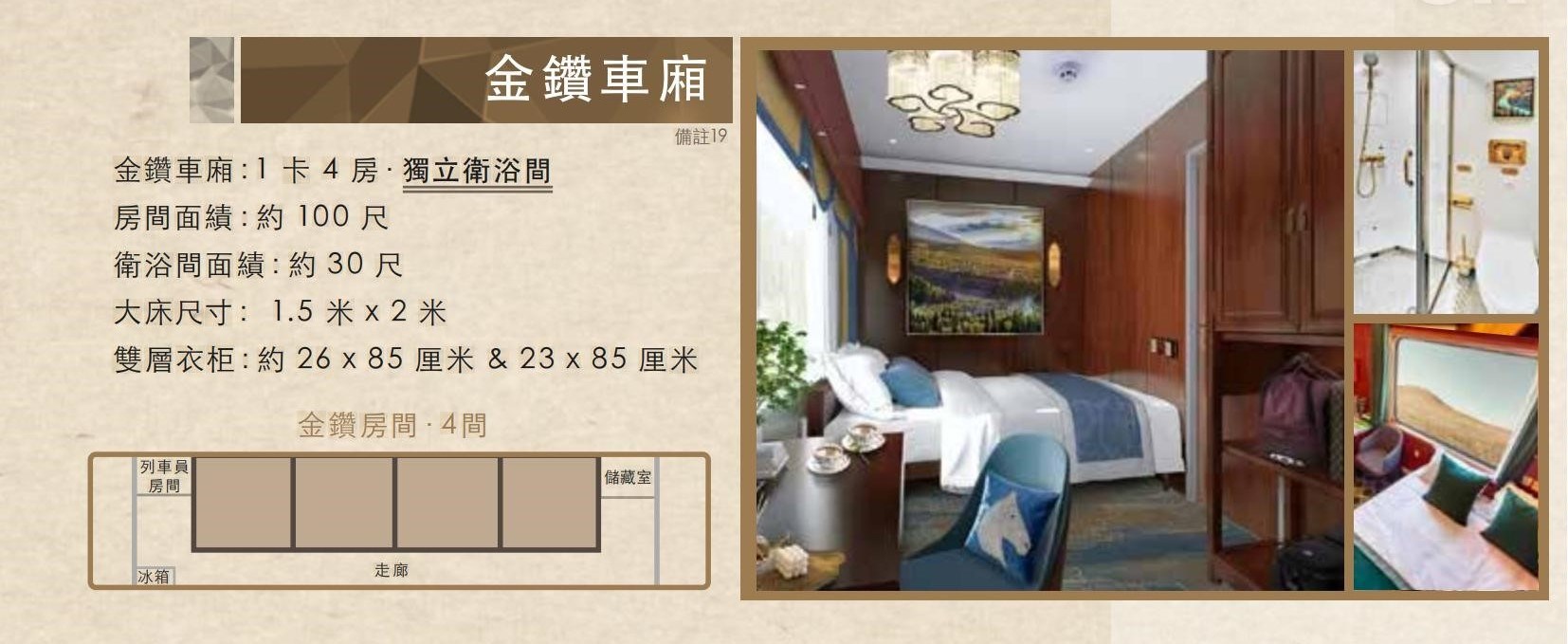 金鑽車廂(有獨立衛浴,一張大床):NT$360,000/人起(一節四間套房,每間套房 10 平方米)。