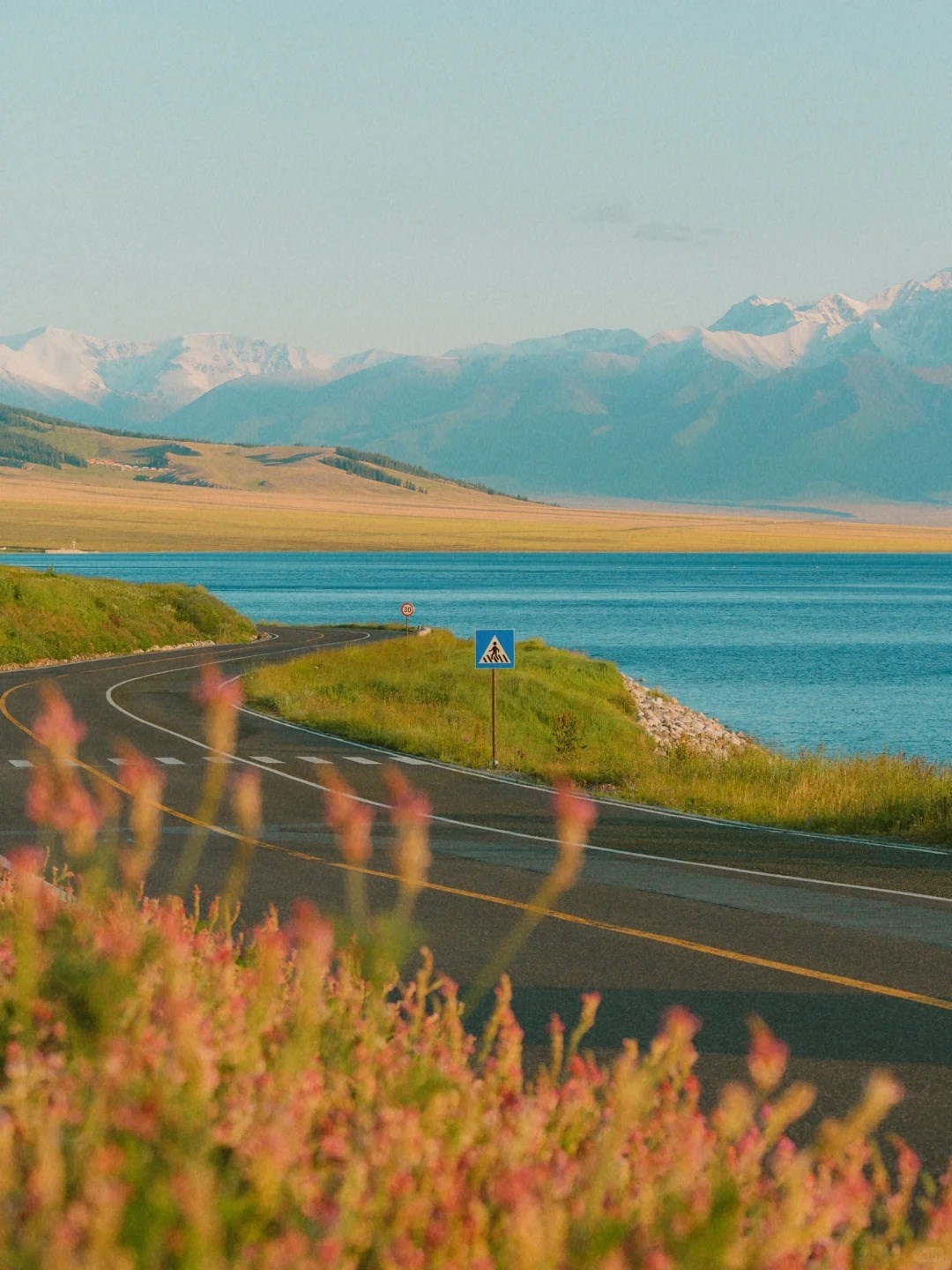 成吉思汗點將臺是攝影愛好者的天堂,清晨的陽光灑在賽里木湖面上,湖水如藍寶石般澄澈耀眼。乘坐越野車沿湖而行,車輪碾過草甸與砂石路,揚起的塵土在空氣中與光影交織。遠處雪山靜靜矗立,近處湖水隨風泛起細碎波光。車窗外,一望無際的草原與花海鋪展開來,油畫般的景色隨著道路變換。