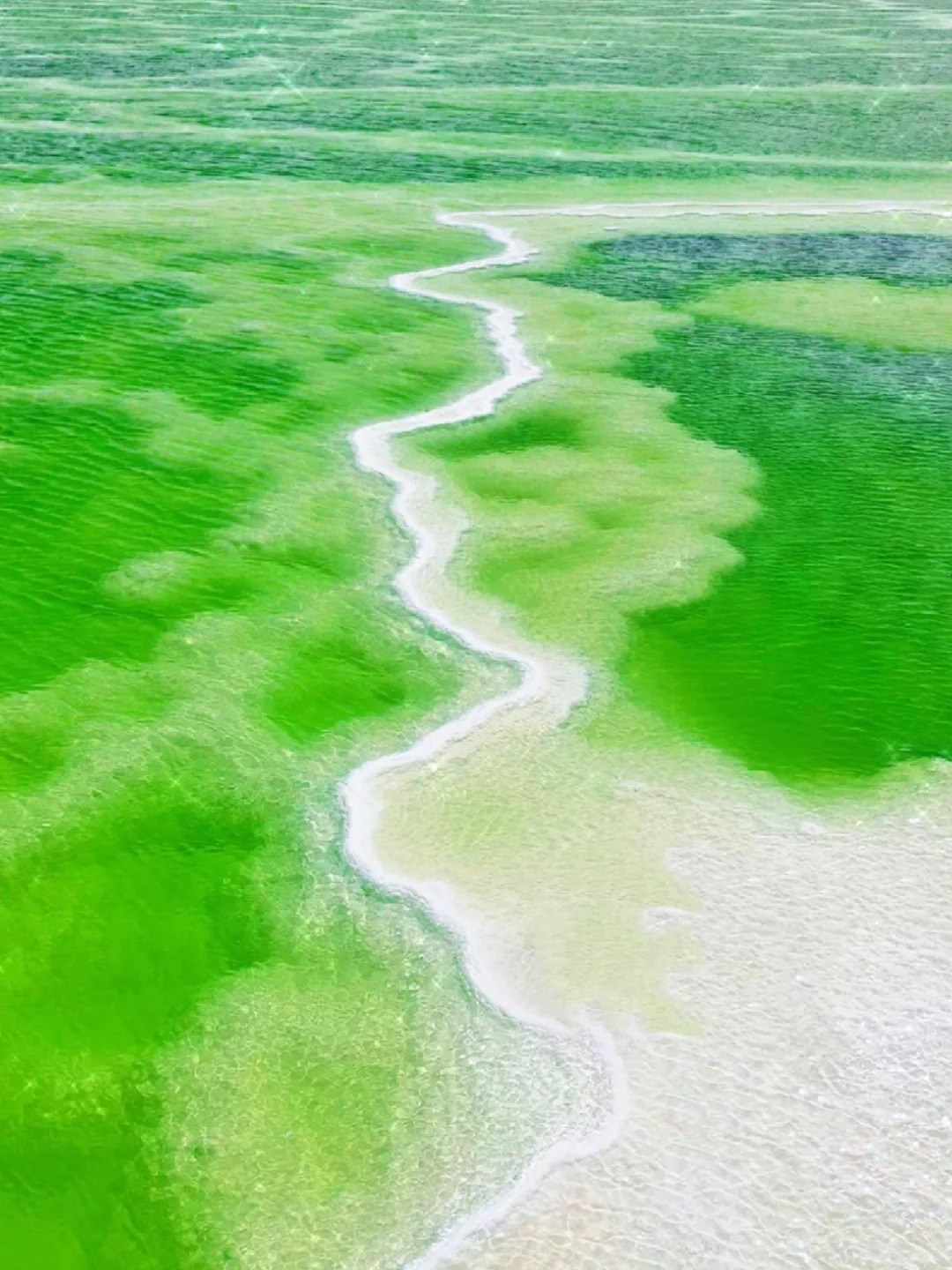在茫茫戈壁之中,察爾汗鹽湖就像一片青蘋果汁,靜靜地躺在大地之上。當夕陽西下,餘暉灑在湖面上,湖水彷彿變成了一片金色的海洋,波光粼粼,閃爍著迷人的光芒。