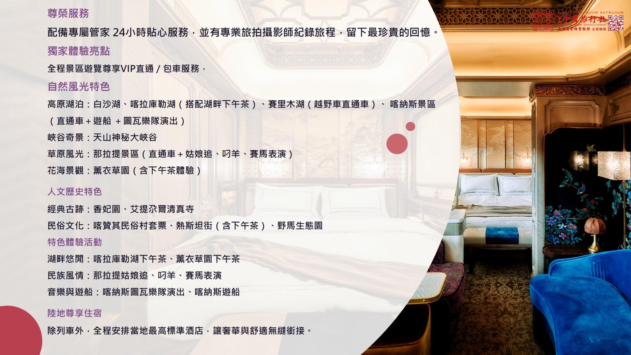 費用包含 歡迎選購高端火車票劵-(一票全包,2人成行系列) 1. 絲路夢享號列車票劵,【火熱預售】:2026/05/26 專列啟程, 長樂清雅居(大床)、長樂雙暉閣(雙床):每人 NT$468,800元/人起 。 2. 「絲路夢享號」,一列精心打造的世界級高品質旅遊列車,以絲綢之路為靈感,將古老文明與現代奢華完美結合。 3. 價格會依出發日期或人數調整,詳情請聯繫業務專員確認。 4. 本行程日期為列車起始日期,可依您的出行需求,購買搭配的班機航程。0526 西寧~0611 成都返回台北。 為配合政府政策,散客組團前往大陸旅遊未開放前,下列行程內容僅供參考!