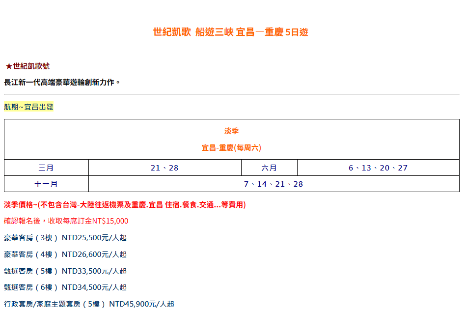 世紀凱歌號(2026) 船遊三峽 宜昌—重慶 5日遊【2人成