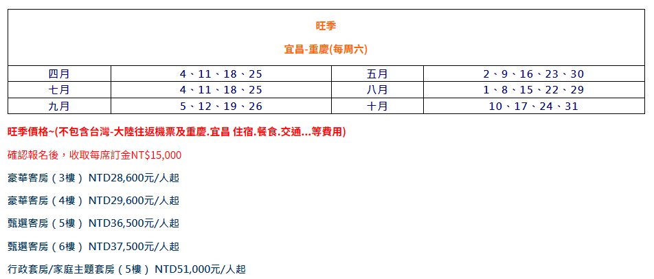 2、重慶、宜昌住宿(可自由搭配或由我社協助預定)